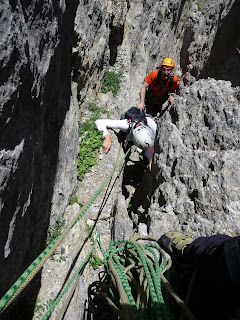 Como punto a comentar, diré que el rápel de 60m (volado en su mayor parte) que hay que hacer en diagonal ya que si vas recto el rápel sería de 63m, no es un buen lugar para estrenarse para aprender a rapelar. Lo digo porque los italianos que nos precedían que iban con un chaval que no había rapelado nunca, optaron por una solución no demasiado académica: él rapelaba con una placa sin ningún tipo de autoseguro (ni shunt, ni machard, etc) y un adulto rapelaba con una cuerda fija en paralelo para 'asesorarle'. Ni que decir tiene que si el 'nen' hubiera soltado la mano hubiera visto delante de sus narices como se esparramaba...