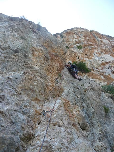 Hay varias opciones de salida y nosotros optamos por la de más a la izquierda con un par de parabolts, en el que lo más difícil es chapar el primero. Aquí también vale la pena vigilar la espalda del que sube de primero. Después ya se alcanza un último resalte muy vertical, aunque con buen canto, que a los 15 metros nos permite alcanzar la R-4.