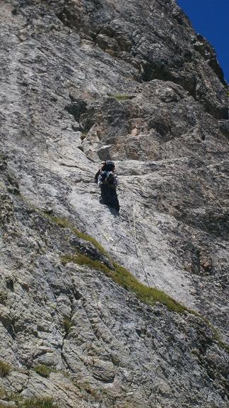 Curiosamente el tramo de diedro de inicio del 6º largo, marcado de V+, fue lo que nos pareció más duro de toda la vía. Cantos romos y mala posición para poder colocar piezas hacen que durante unos 8 metros haya que apretar de verdad. Después ya se sigue en diagonal a la izquierda hasta llegar a los 10 metros al primer parabolt junto a una laja que mejor no tocar. Después se va resiguiendo un agradable espolón (IV+), donde encontraremos 3 parabolts más y llegando a los 45 metros a una buena repisa donde encontramos la R-6, tambiés con un par de parabolts.