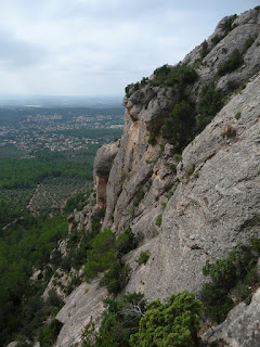 El lunes, festivo en Barna, contacto nuevamente con Jordi C. y quedamos inicialmente para subir a escalar a Gorros, pero finalmente hacemos cambio de planes y optamos por investigar las vías de la derecha del Serrat d'en Muntaner en su cara Este, donde yo no he escalado y Jordi escaló con Assumpció la Alberto González.