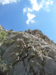 Se anima Jordi con el primer largo, donde su inicio es el paso más difícil de la vía (6a), aunque no obligado al estar los dos parabolts que lo protegen muy próximos como para poder trampear en caso de necesidad. Es un paso de entrada en desplome donde hay que 'tibar' y lo vimos más claro superándolo por la derecha, aunque el segundo parabolt queda un poco mal ubicado. Después ya se alcanza una placa de buena roca (V) donde encontraremos chapas y alguna sabina con cordino, encontrando la R-1 de dos parabolts a los 35 metros. En total 9 parabolts, un puente de roca y dos sabinas con cordino.