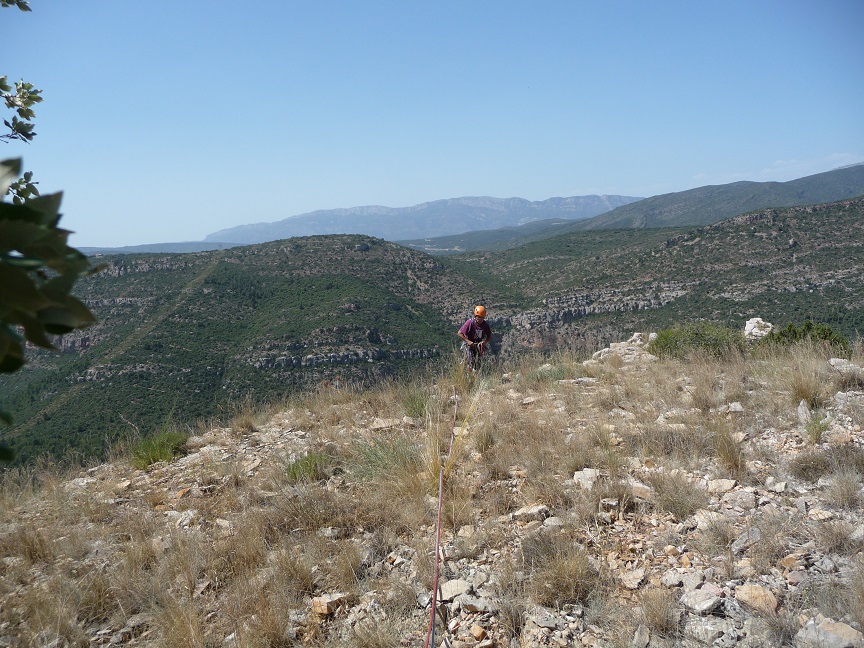 El sol ya empezaba a apretar y rápido fuimos a buscar la instalación del primer rápel, al que reforzamos convenientemente, al saber que después lo podríamos recuperar al acabar la vía. Como se indicaba que el rápel más largo era de 25 metros, ya emplazamos los tres con una sola cuerda y advertir que en el primero llegamos con 30 metros justos a un árbol donde poder engancharnos y llegar a una repisa para recuperar la cuerda.