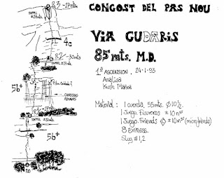 El sábado, también con previsiones que apuntaban posibilidad de lluvias, optamos por hacer una matinal en Ca la Montse y sin plan fijo, quedamos en tomar algo en Cal Anna y allí decidiríamos, En el bar encontramos a bastantes conocid@s y volvimos a respirar el clásico ambiente de escalada que hasta antes de la pandemia siempre se respiraba. Después de los cafés, revisando reseñas Jordi encontró una que le faltaba y que yo sólo había escalado en una ocasión, hace 10 años, con Xacó y Jooaquim Ricarte: '