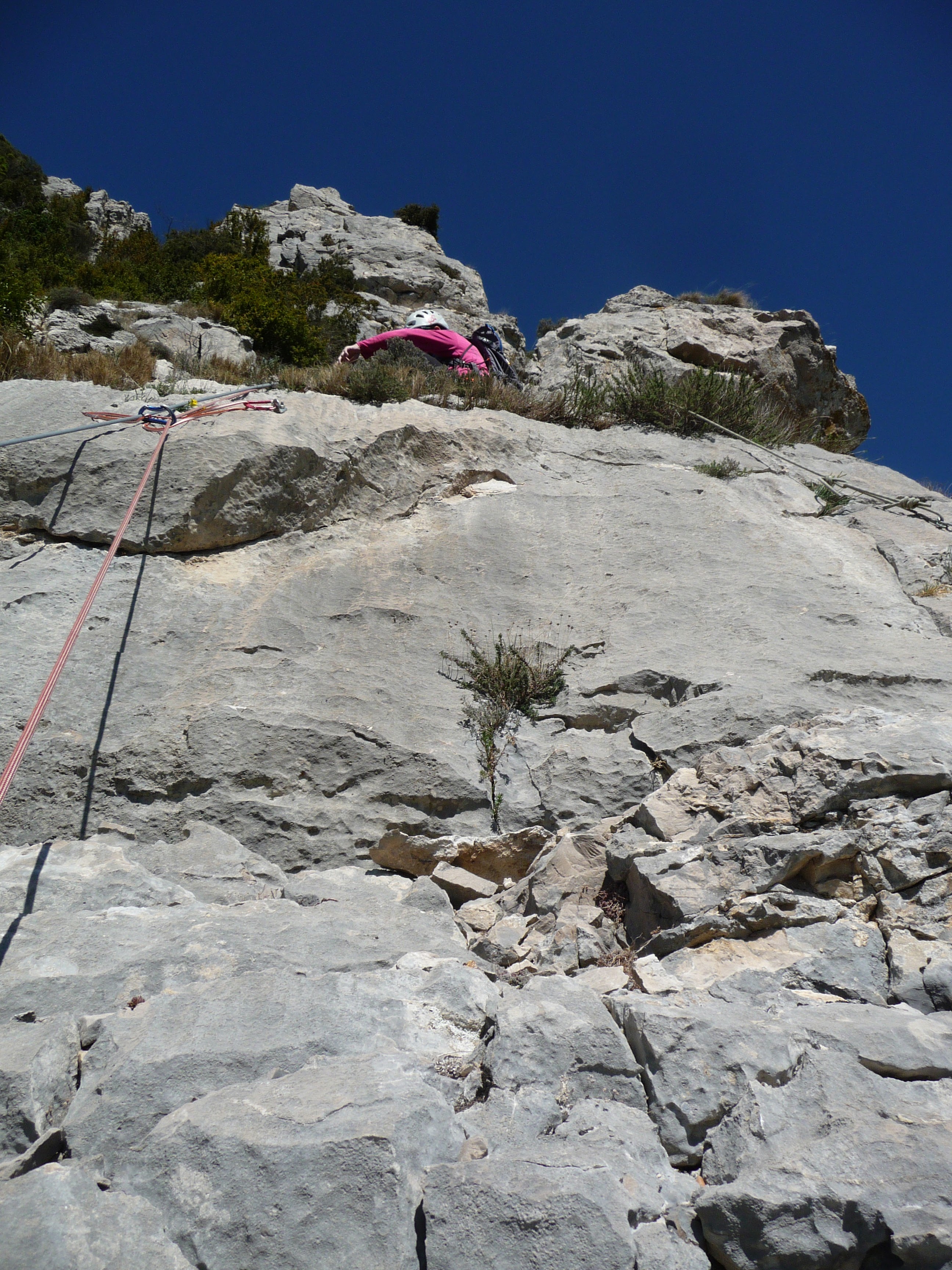 Como el viento parecía haber amainado acordamos proseguir y seguí con la itención de enlazar con el segundo largo de la Bona Feina. Chapo algún anclaje hasta llegar a una vira donde por sorpresa veo que hay dos líneas de chapas que salen de ella. Opté por la de la izquierda, que resultó ser la de la Bona Feina y después en casa ya descubrimos que era otra variante abierta por Joan Baraldés. A los 30 metros ya llegué a la R-2 de Bona Feina y recuperé a los compañeros.