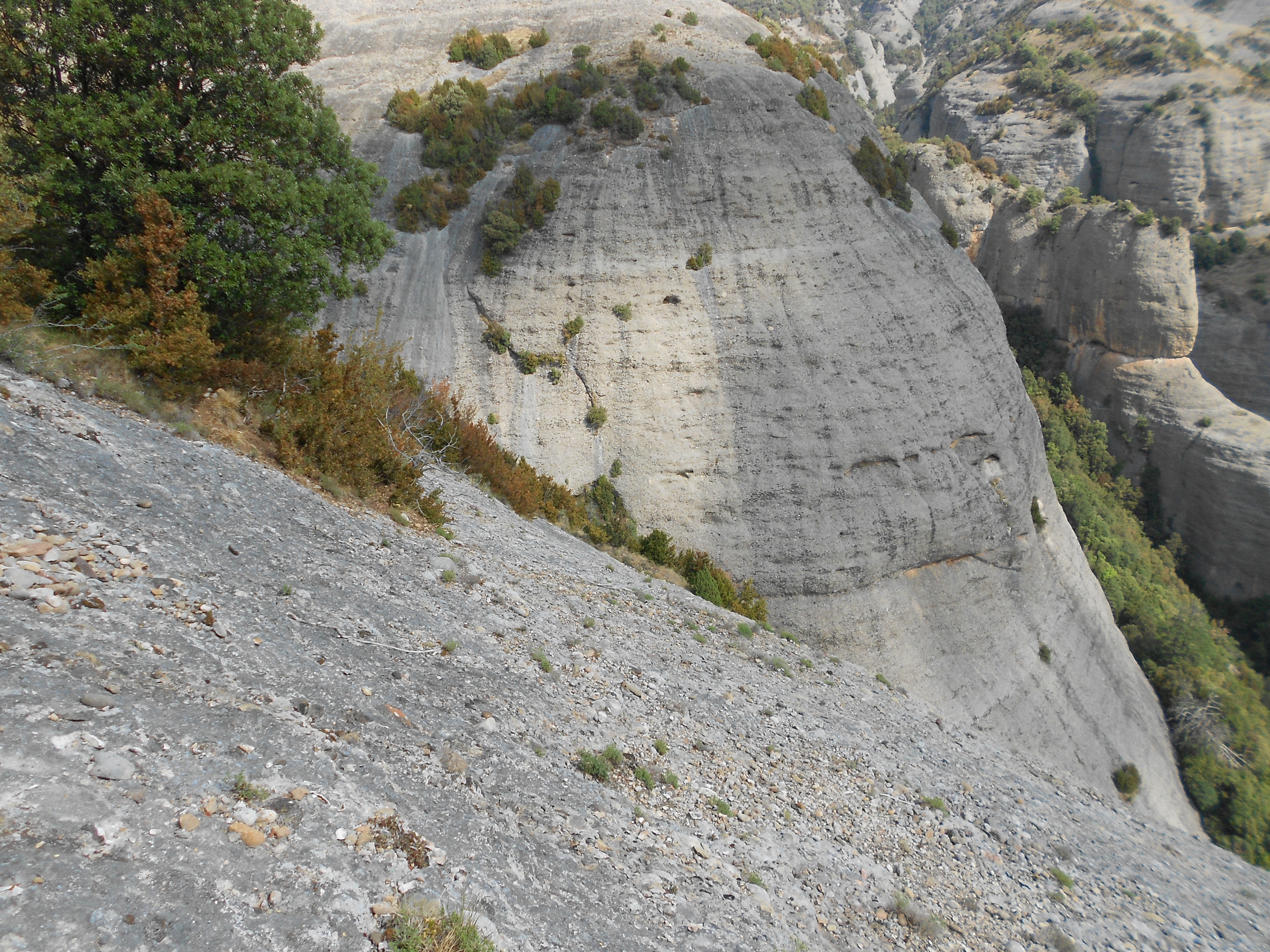 Nada más empezar a desplegar las cuerdas ya detectamos que íbamos a tener problemas con las mismas al estar rizadas, así que aunque se pueden enlazar los dos últimos largos con un solo rápel, acabamos por tener que efectuar cinco rápeles para llegar a la R-0. Al bajar ya reconocí la pared por la que sube la Escaladors Bucòlics. Todas las reuniones están equipadas con dos parabolts y una sola argolla, por lo cual es conveniente dejar o maillons o mosquetones que después al escalar iremos recuperando. Durante el descenso estuvo bastante rato sobrevolando sobre la zona un helicóptero que parecía buscar algo o alguien, pero no vimos que hicieran ningún rescate.