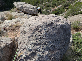Al llegar al suelo como por arte de magia desapareció todo el mundo, no se si tuvo algo que ver la retransmisión del clásico Barça-Madrid de fútbol, y ya rapelaron detrás nuestro la cordada de Esperó Blocaire. Así que después de plegar cuerdas y reposar unos instantes, ya nos fuimos a por nuestro segundo objetivo y recorrimos la base de la pared hasta llegar al mismo. Me sorprendió ver tres personas que había ido con equipo de espeleo a ver la Cova de les Arnes y quedaron algo defraudados (no se que se esperan encontrar). Esta vez se animó Mamerto a comenzar mientras advertíamos a los visitantes de la cueva que después tendríamos que rapelar al punto donde estaban. El compañero fue subiendo, encontrando algún paso más duro que la anterior vía y llegó a la R1 sin más contratiempos, estando a la sombra.
