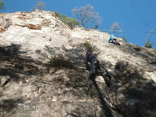Iniciamos con la vía Korra, buena vía pero en la que gracias a la enorme sombra que proyecta un gran árbol en su primera mitad, hizo que nos quedaran los dedos bastante fríos, aunque afortunadamente al salir al sol el cambio lo compensaba rápidamente. Puede ser un 6a de 25 metros con roca excelente, pero graduado más por su continuidad que por ningún paso en concreto.